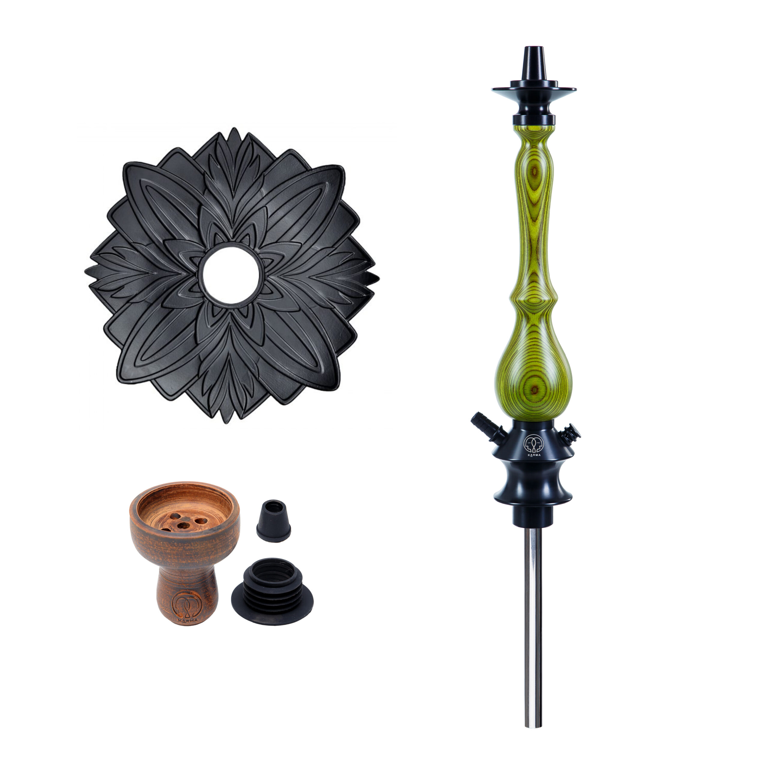 Karma Hookah – український виробник кальянів преміальної якості з використанням натурального дерева, епоксидної смоли, анадованого алюмінія та нержавіючої сталі. Діаметр шахти в 14мм забезпечить м’яку класичну тягу, комплектна прямоточна чаша (об’ємом 18-20г) – простір для експериментів, блюдце з анодованого алюмінію – неповторний дизайн, а з’єднання шахти з колбою на ущільнювачі – практичність у використанні.